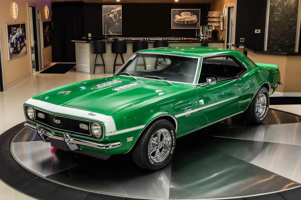 Check out this beautiful 1968 Chevrolet Camaro! This numbers-matching Camaro is Jerry MacNeish-certified and has undergone a complete rotisserie restoration with no expense spared! The exterior is finished in the correct factory Rally Green with white Super Sport striping. Under the hood sits a Chevrolet 396ci Big Block V8. Power is sent to the rear wheels through a Turbo 400 3-speed automatic transmission and a factory 12-bolt open rear end with 2.73:1 gears.